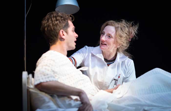 And when he does pause in that whirlwind, it gives a sense of just how carefully he has played it.If that is Prior still defiant one of the other key moments of that elusive vulnerability is his scene with Hannah in the hospital. Already discussed in terms of Susan Brown’s wonderfully tender performance. This is the moment where it feels like Prior finally runs out of steam- literally breathless at this point, he seems finally not broken, but almost captured by the illness he’s been trying desperately to outrun. And , here for anyone struggling with the ‘up there’ Prior that Garfield gives us, is where it actually makes most sense. Because at this point Prior is still fighting to be ‘on’ to be on the defensive, fighting with everything he has- which is camp and humour and by this point as well as downright bitchy nature toward anyone who wrongs him because it’s the only fight he has yet. But finally, finally his body is taking over and stopping that fight. So, Garfield pitches him at a middle ground- he doesn’t quite give in, he’s not quiet and contemplative, his not broken and sobbing he’s still trying sassy lines ‘I wish you would stay more true to your demographic profile’ as still delivered with style, but everything is turned down a notch. It’s only then at the end of the scene when he asks Hannah to stay- a parallel to his begging Louis to stay- and she agrees does something quietly break. Hannah’s care for him is what eventually breaks through Prior’s defences- and that’s a cleverly played move. Because that need for care is what puts him on that extreme footing. And when others offer him care it’s the only time he comes down from the point of near hysteria he ends up living his life on. When Belize first reaches out to him in the hospital and he sobs, and now when Hannah touches his cancer-marked skin. Kushner actually writes it into the stage directions here ‘He Calms down’ but Garfield takes that an makes it bigger than that moment. For his Prior Hannah’s care brings him down and crashes through a defence mechanism he’s been holding onto and holding up for so long. There’s no great sobbing this time but the quiet in that scene is so telling, and more moving because it’s pitched against all the moments of loud raging against the light he does to this point. It’s a long game Garfield plays, across these long plays and there are moments like that of pure gold in it that make it worthwhile.