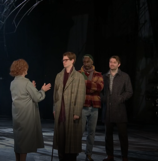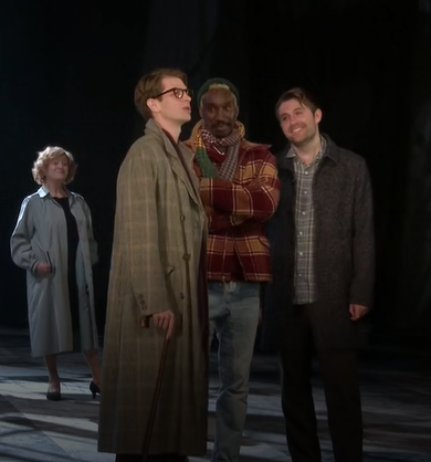 Garfield shifts his performance too, I’ve written before about a theory of that moment in his performance bleeding both actor and performer- is it a bit of Prior an Garfield addressing us at that moment? Perhaps. And although he starts his monologue earlier in the scene with ‘Let’s turn the volume down on this’ that portion of Prior’s address is delivered as a monologue, within the world of the play. It’s at the final line of the first monologue ‘It’s January 1990’ that something switches in his delivery- he leans in a makes it clear to the audience it’s for them. His tone shift, like a lecturer romanticising on the play. He shares a nod a joke with the audience ‘I like them best when they’re statuary’. And then Prior/Garfield breaks the walls down for everyone else- until now, in the background in character. With his ‘Louis will tell you her story’ he breaks Louis out of that world and into the world he is addressing – our world. McArdle plays is well with a startled ‘Oh. Um’ and a look of realising the audience are suddenly there. With him Belize and Hannah seem to also blur the lines as well. The three of them stand somewhat awkwardly with Prior like children suddenly presented to meet a teacher as he concludes his speech.