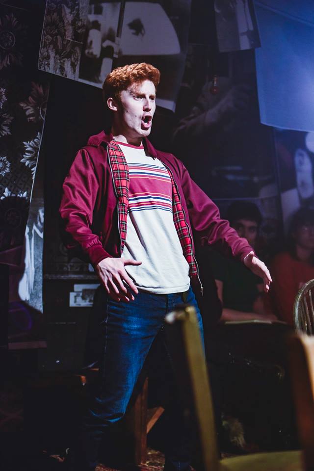 The set and direction elevates what is already a remarkable piece of writing. Designer April Dalton has expertly crafted a time capsule 90s pub room (though in fact a fair few of these still hang on in Cardiff). From the garish mish-mashed carpet, to the velvet covered bar stools, battered low tables and even plastic ashtrays. Stepping in from the bar at Porters- all 00’s cool and Hipsters- feels like being pulled back in time to pubs and Britpop. You can almost smell the time of cigarette smoke and alcoho-pops. The design works effectively for the storytelling, with Hammett weaving in and out of tables- at times clambering over audience members. But also able to pause in front of a table, and tell his story directly to whoever is front of him. It’s intimate in a way that is stark even for The Other Room space, and it’s incredibly effective in transporting the audience into that world. Credit particularly to Ryan Stafford’s lighting design, that helps convey the sense of place as it moves from home to pub, to club to house party to cold street. Interwoven with sound design that weaves both ‘Bangin’ 90s tunes’ from the tape deck, through to an ocean and even Caroline Street on a weekend (that is after all a particular sound). Matthew Holmquist has with his team truly crated the world of the play, and it feels like being part of a very particular moment in time.