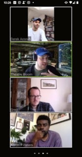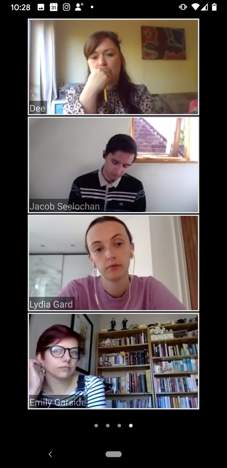 It’s something when you come off a virtual rehearsal and feel like you’ve been in the room. Our director Neil said to me ‘we could have been messing about in the Tillman’ (which is a space at the Arena theatre, which we have both spent considerable time messing about with plays in). And for a moment it all felt sort of normal. Except that I can’t hug any of them. And I really want to hug all of them, a lot. (This includes our resident virtual rehearsal crashers baby Alana and cats Nimbus and Rouxfio).