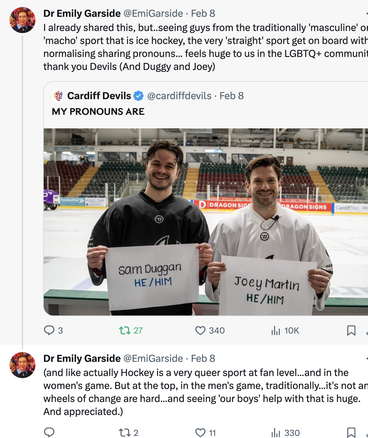 Seeing the guys sharing pronouns did mean a lot. With so much vitriol against the Trans community right now, this felt like the team at Cardiff Devils had listened when asked what they could do to make an impact.